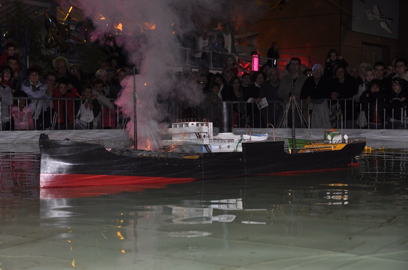 Vous y verez aussi un spectacle pyrotechnique d'un cargo prenant feu, qui se brise en deux puis coule (toujours une tres grosse impression sur le public). Un systeme de charnieres et de balasts, une fois vidangés, des cables, via un treuil, retendent les elements separés.