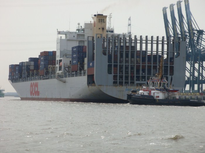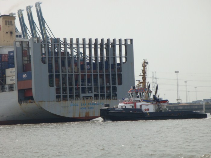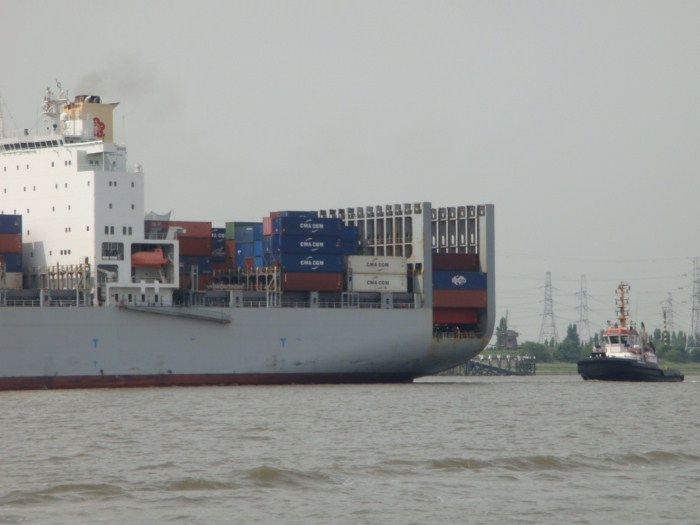 - Anvers mise en place du navires par les remorqueurs dans la darse sur l' Escault devant l' écluse du Zandvliet
