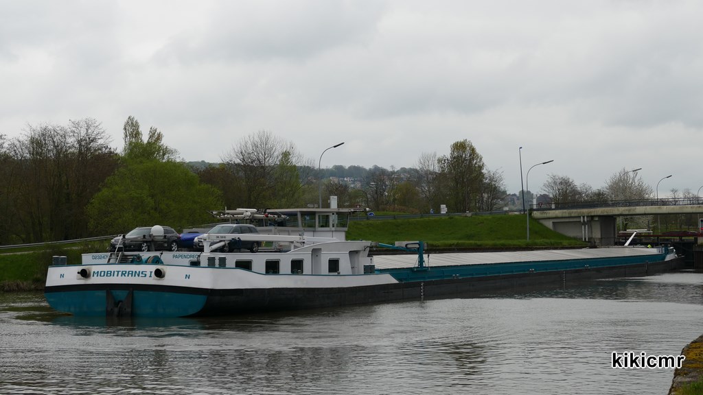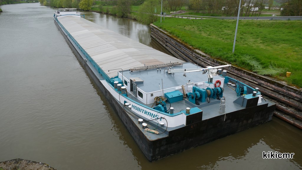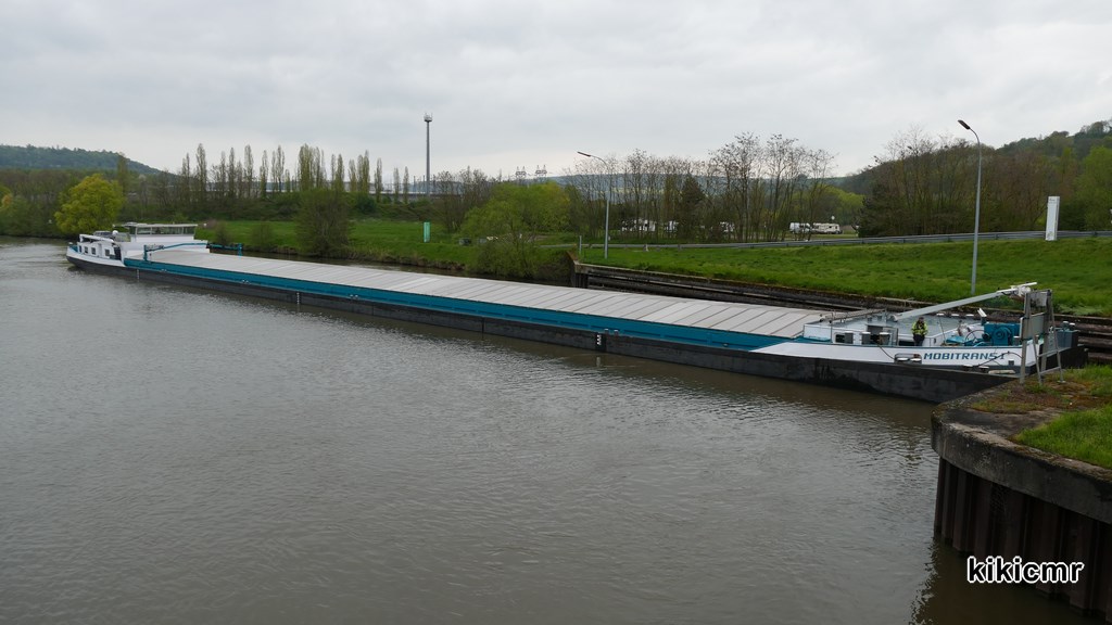 MOBITRANS I à l'écluse de Frouard (54), le 23 avril 2016, pendant que sa barge écluse seule, le sas étant trop petit pour écluser le KVB en entier :