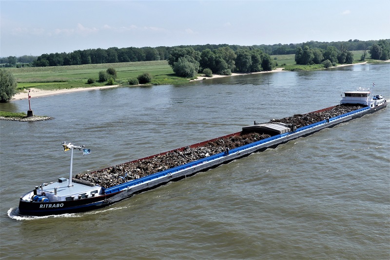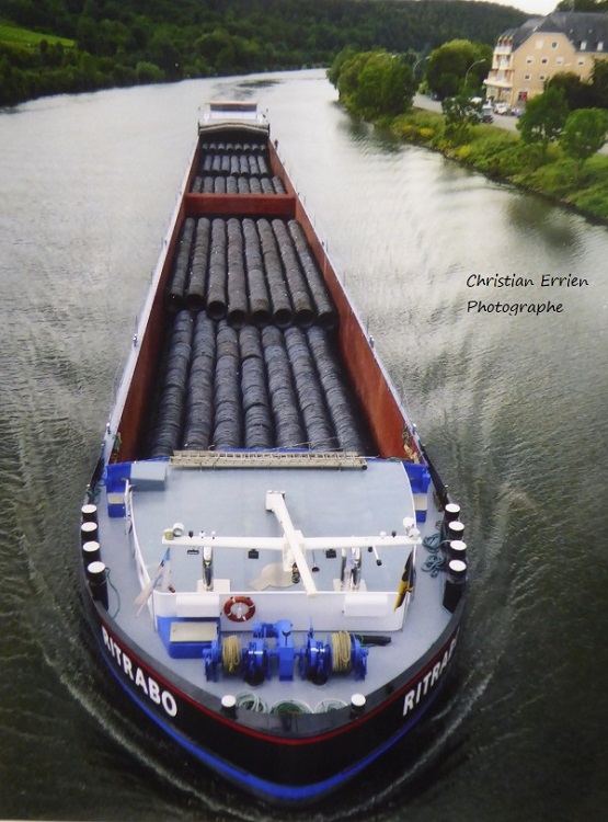 C'est un habitué de la Moselle française, jusqu'au terminus de la navigation à grand gabarit ! Sur les photos de Christian, il est avalant, chargé de bobines de fil-machine, elles proviennent sûrement de la SAM, l'aciérie électrique de Neuves-Maisons. Quand il est montant, c'est avec de la ferraille qui sera fondue là-haut, comme par exemple ici, sur la Moselle canalisée à l'écluse de Villey-le-Sec, en août 2017 :