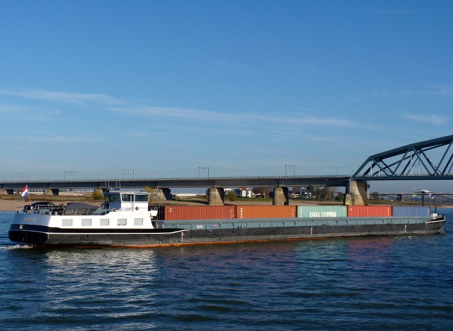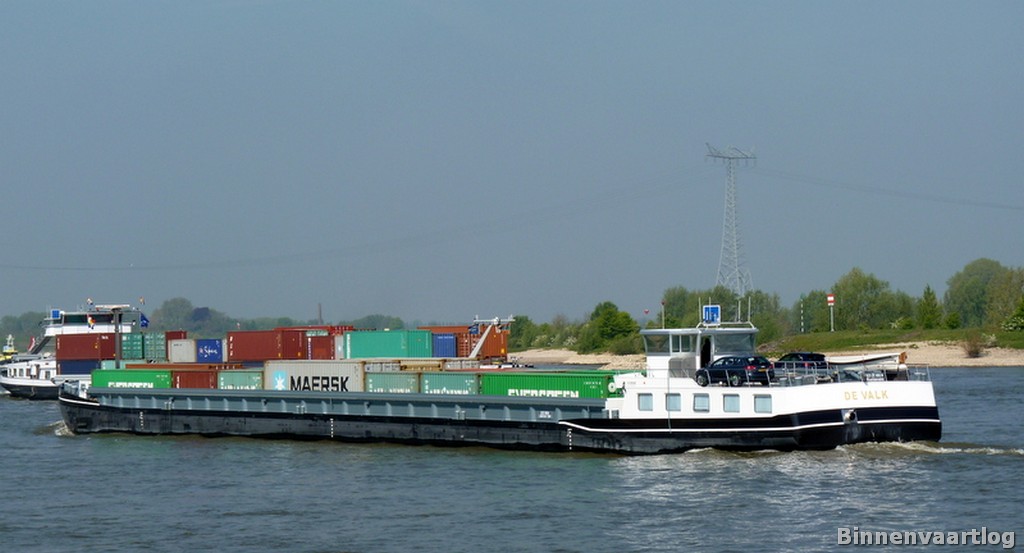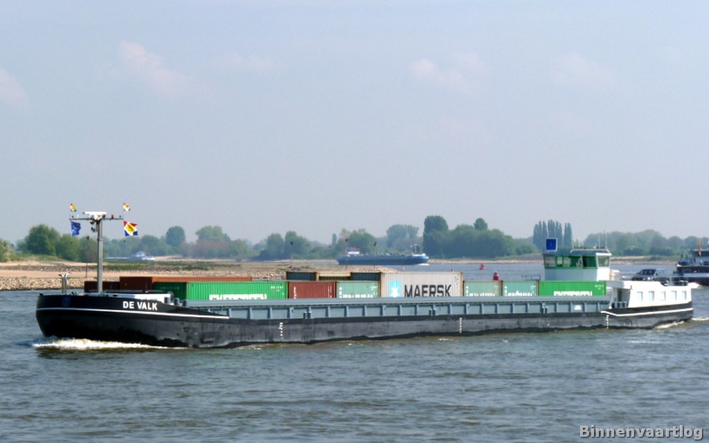 De Valk , 85,95 x 9,55 x 2,97 , 1675 ton , Bouwjaar 2006 , Werf Poppen in Zwartsluis ( Nederland ) , 953 pk Mitsubishi en 430 pk DAF - van Wijk Boegschroef , eigenaar Vof. De Valk (C.J. van Wolfswinkel) in Barneveld , ENI 02327495
