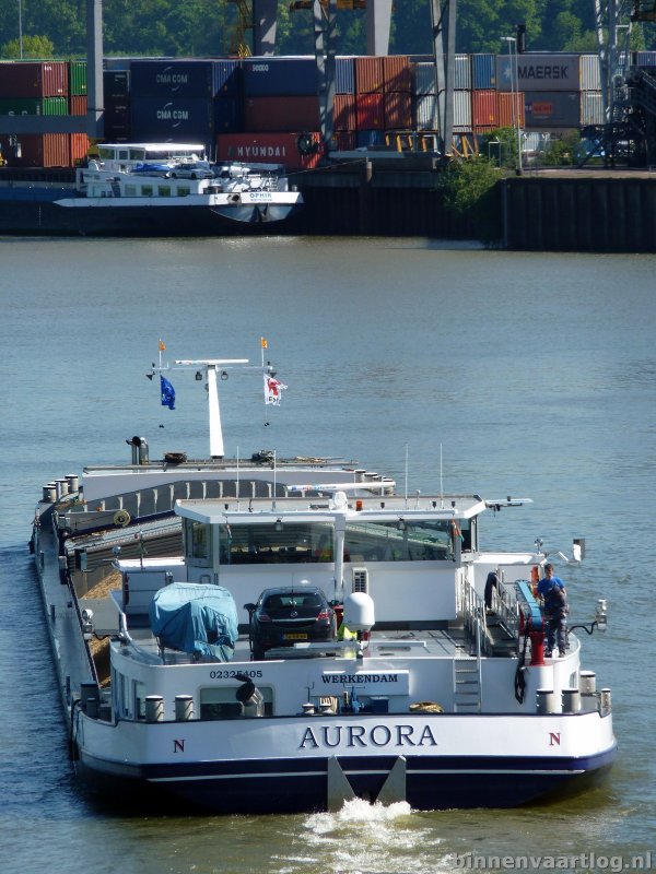 Aurora , 109,96 x 11,45 x 3,49 , 2961 ton , Bouwjaar 2002 , Werf Santierul Naval Orsova SA in Orsova ( Roemenië ) en Koedood Dieselservice in Hendrik Ido Ambacht ( Nederland ) , 1591 pk Mitsubishi en 490 pk Mitsubishi – Verhaar Omega-Jet boegschroef , ex Seinpost , eigenaar Vof. Verdoorn – Hovestadt in Werkendam , ENI 02325405
