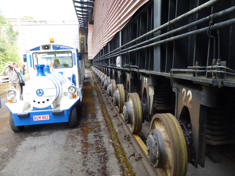 le parcours en bateau par les bacs n'est plus possible et il est remplacé par une ballade en petit train sur pneus le long de la voie des bacs dans le fond. (Le prix est diminué substantiellement, voila des commerçants honnêtes) On descend avec les bacs à gauche, on passe par un tunnel sous l'entrée aval et on remonte par l'autre coté, les bacs toujours à gauche.