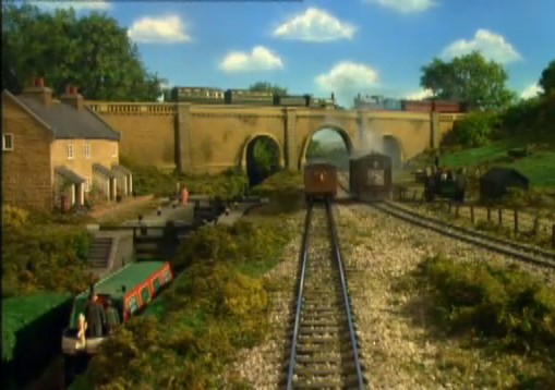 Un narrowboat qui attend devant une narrow-écluse avec portes à balanciers ! Paysage typiquement anglais, allez trouver une écluse dans un dessin animé français... Par contre, ni devise, ni matricule lisibles... :(