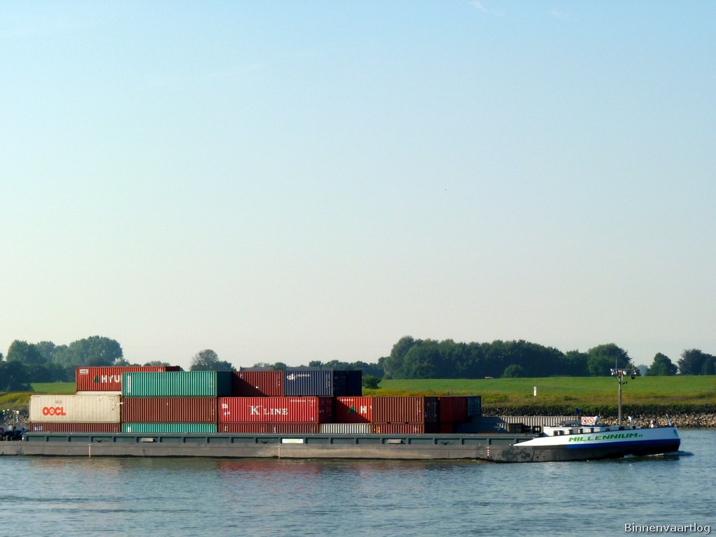 Millennium , 105,00 x 11,45 x 3,50 , 2982 ton , Bouwjaar 2010 , Werf Begej Shipyard in Zrenjanin ( Servie ) en Dolderman BV in Dordrecht ( Nederland ) , 2 x 1836 pk Caterpillar en 608 pk Caterpillar Verhaar Omega-Jet boegschroef , eigenaar Bosman De Bot Vof in Zwijndrecht , ENI 02332799