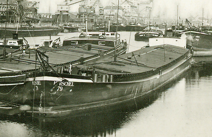 Le chaland rhénane "Herschel" avec le numéro 79, construit en 1904 à Lekkerkerk (par??) comme "Mercator". Puis "Stad Mechelen" et francais "Herschel", Soc. Francaise de Navigation Rhénane, Strasbourg.