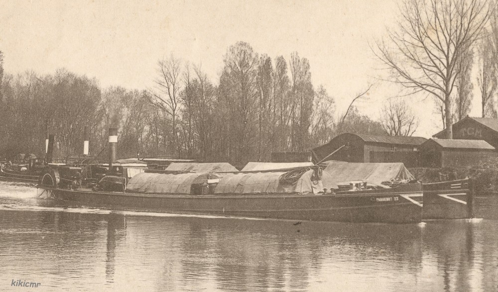 Sur cette carte postale écrite en avril 1904, deux porteurs à vapeur de l'HPLM passent, bord-à-bord, devant le dépôt des toueurs de la compagnie TCM (Touage de Conflans à la Mer) :