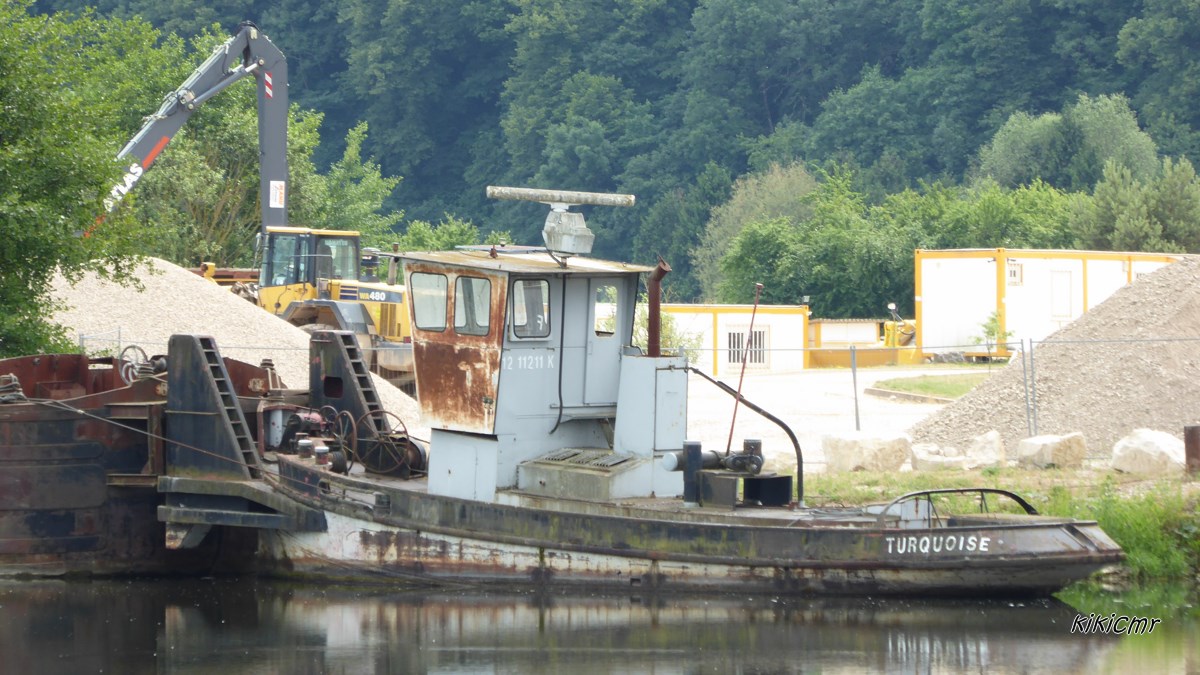 Sur les photos, il est brêlé (c'est comme ça qu'on dit ?) à une barge qui ressemble furieusement à une B de chez Solvay, mais malheureusement sans indice pour l'identifier ! et à côté, c'est aussi un ancien Solvay, le NEPTUNE ex SOLVAY 77. Et derrière, côté berge, c'est aussi une ancienne barge Solvay, l'OMBRE ex B5. Et côté rivière, le CERON...