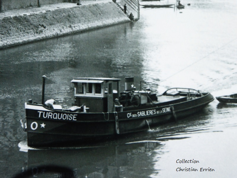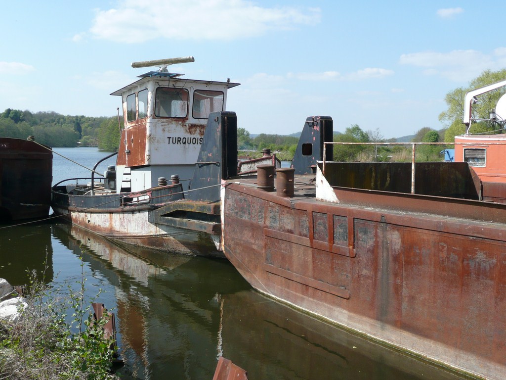 Sur les photos, il est brêlé (c'est comme ça qu'on dit ?) à une barge qui ressemble furieusement à une B de chez Solvay, mais malheureusement sans indice pour l'identifier ! et à côté, c'est aussi un ancien Solvay, le NEPTUNE ex SOLVAY 77. Et derrière, côté berge, c'est aussi une ancienne barge Solvay, l'OMBRE ex B5. Et côté rivière, le CERON...