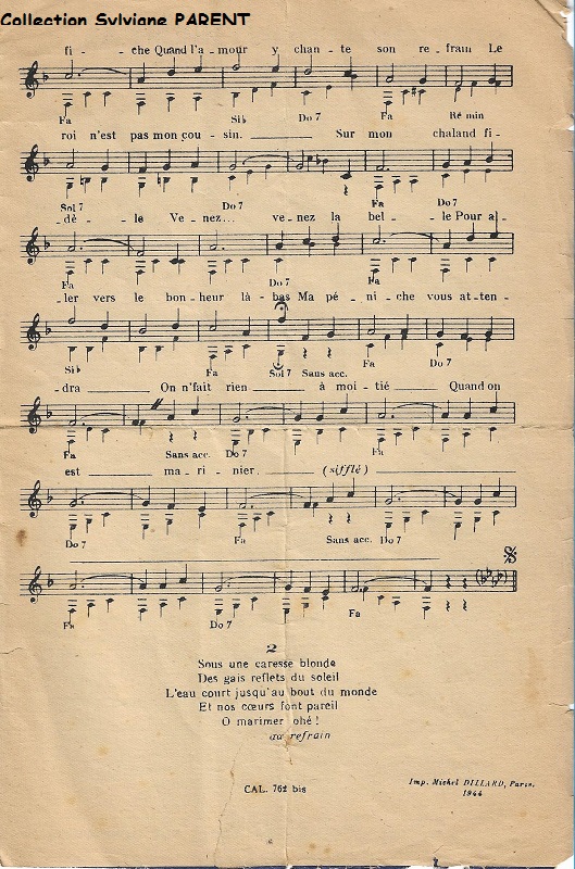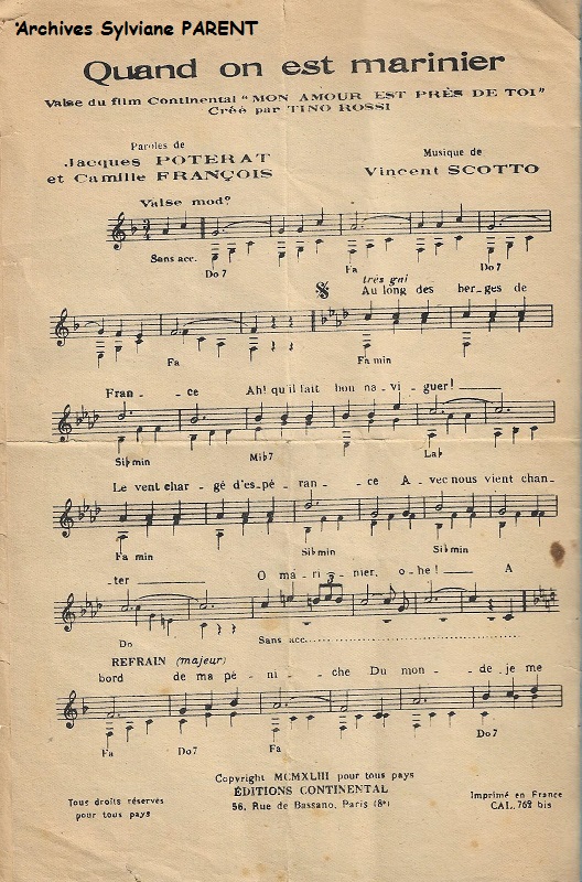 Partition de la chanson Quand on est marinier Chanson du film ''Mon amour est prés de toi'' avec Tino Rossi