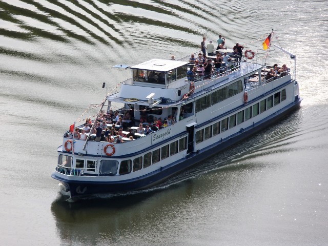 Saargold , 38,40 x 5,80 x 1,00 , Bouwjaar 1963 , Werf Lux Werft in Mondorf ( Duitsland ) , 2 x 260 pk MAN , ex Beethoven , ex Mussel II , eigenaar Saar Personenschifffahrt ( Hauck ) in Saarburg , ENI 04805240.