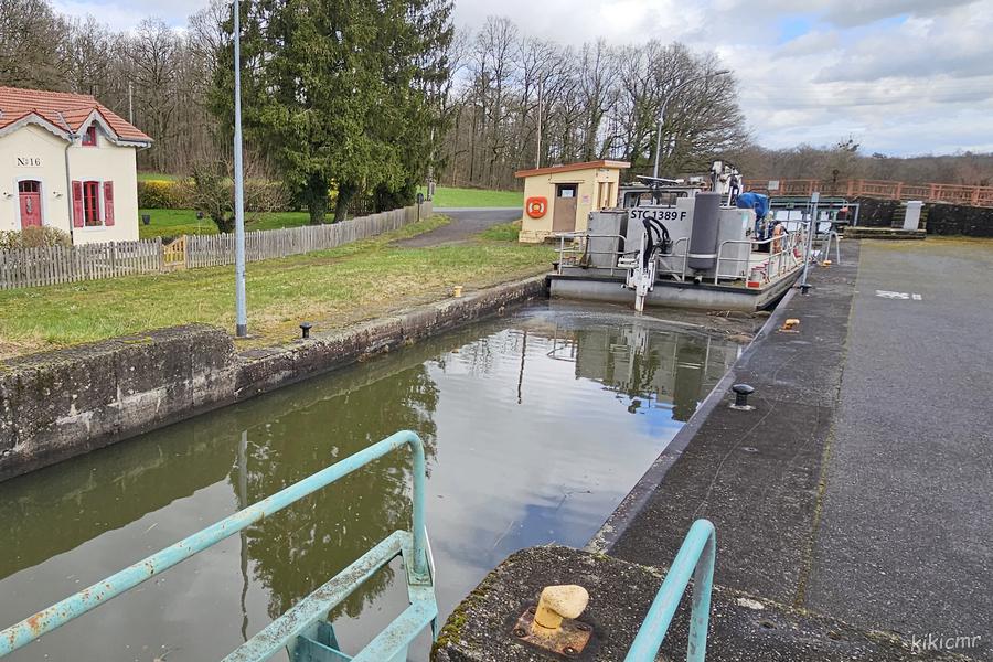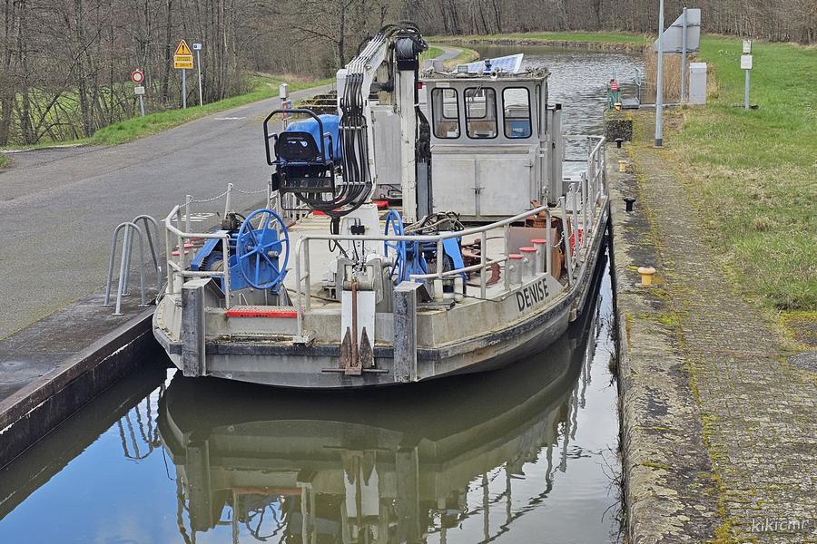 Le ponton multifonction de VNF en service sur le canal des Houillères de la Sarre, mis en service en 2010, dans l'écluse n°16 d'Altwiller (67) en mars 2024 :