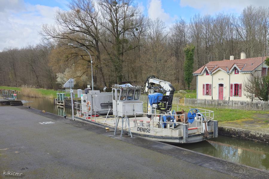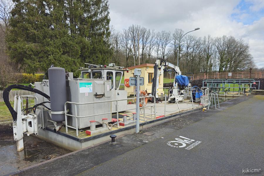 Le ponton multifonction de VNF en service sur le canal des Houillères de la Sarre, mis en service en 2010, dans l'écluse n°16 d'Altwiller (67) en mars 2024 :