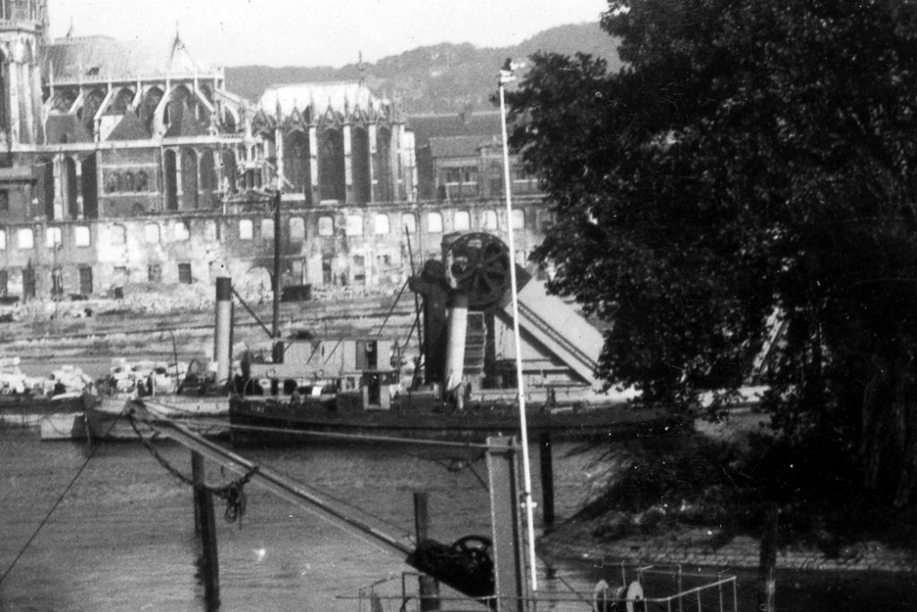 Une photo prise à Rouen pendant la guerre. En arrière-plan une drague inconnue, et un remorqueur, je crois à lire "Vire"