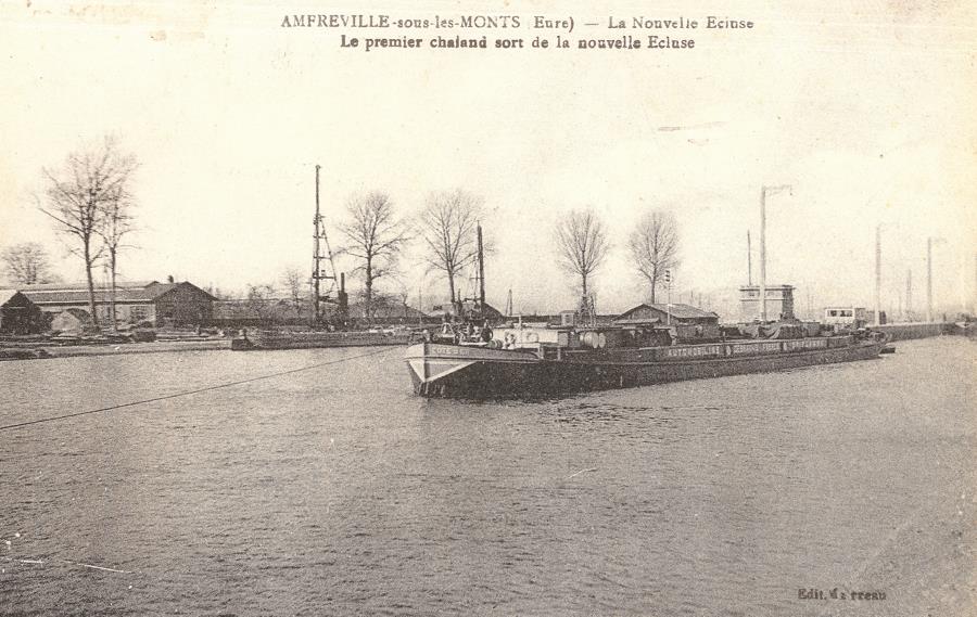 C'est une carte postale dont mon exemplaire a voyagé en 1942. La légende indique qu'il est le premier chaland du premier convoi à avoir franchi la nouvelle écluse d'Amfreville, peut-être quelqu'un pourra-t-il nous préciser l'année ?