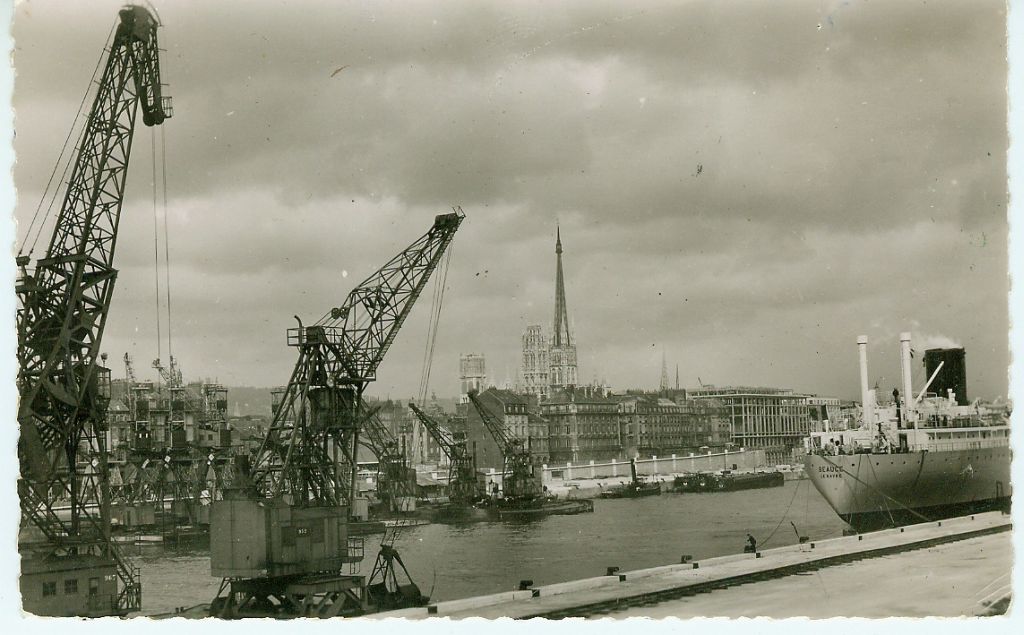 L'"Océan" ex "Aramis" à Rouen, à droite le pétrolier "Beauce", en service depuis Mars 1953. Et une très grande nombre de grues flottantes, je peu lire les numéros 967 et 952.