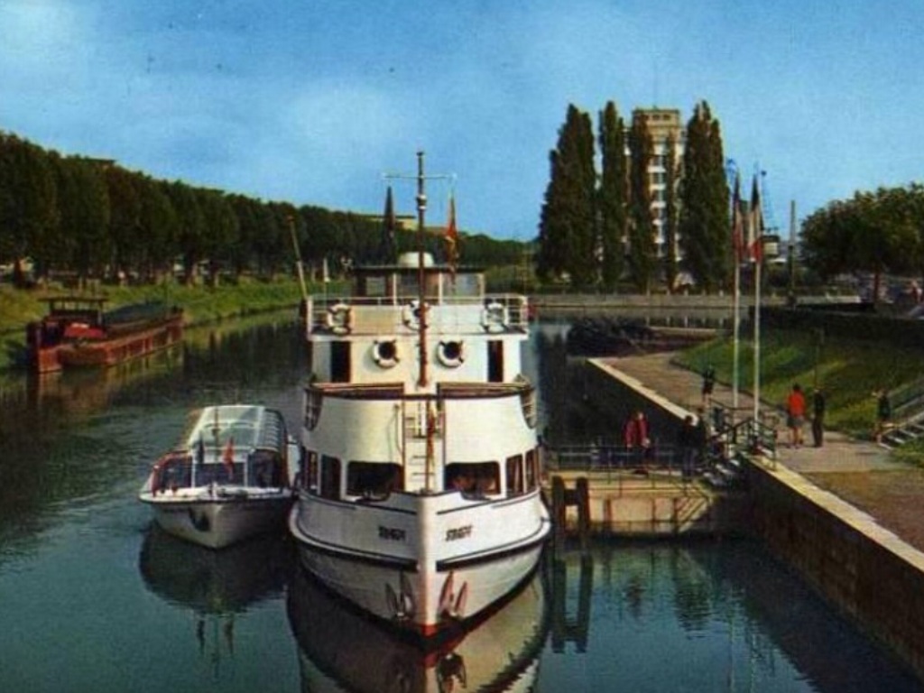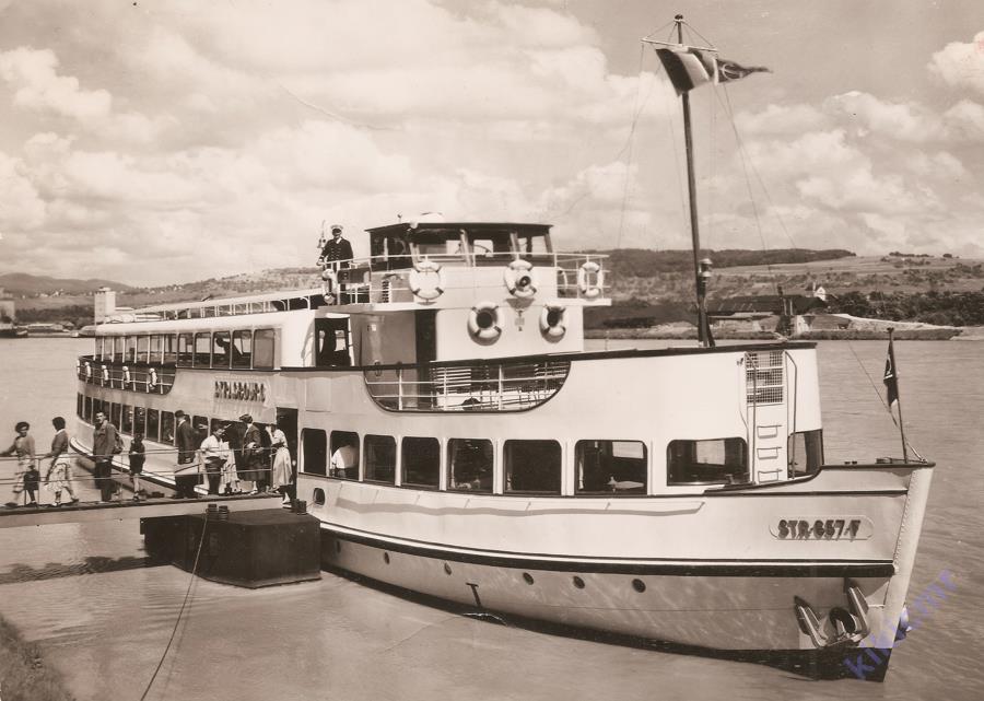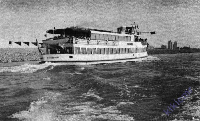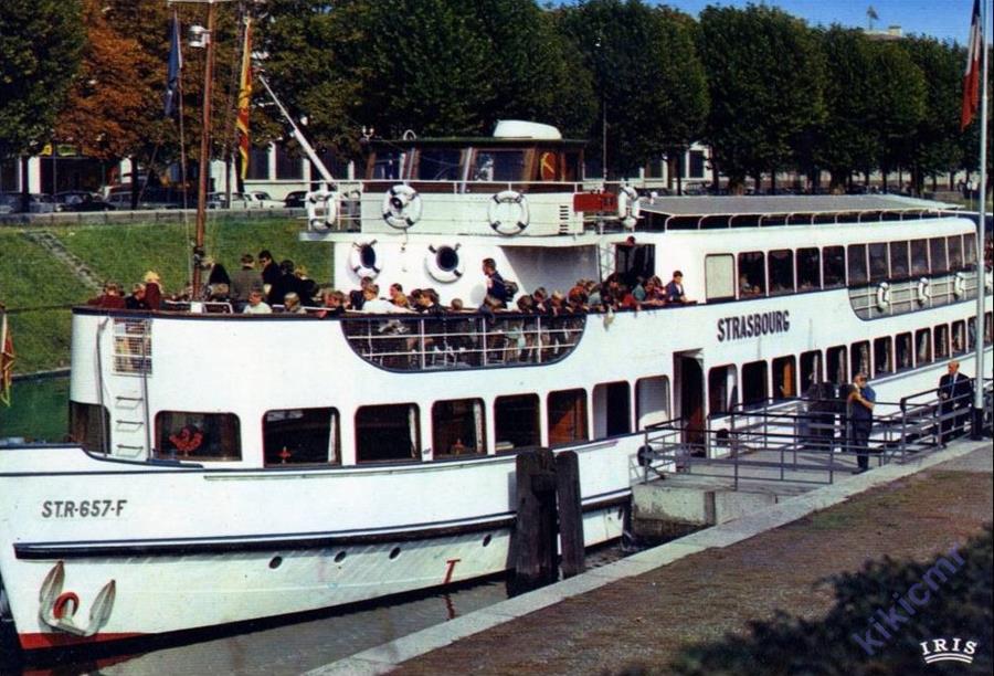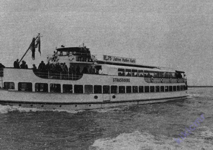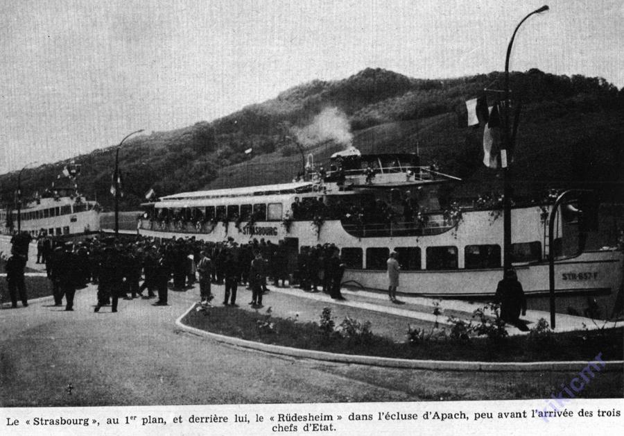 Bon perso je n'en ai que deux, mais y en beaucoup d'autres ! Le STRASBOURG à la Loreley, le STRASBOURG par-ci, le STRASBOURG par-là... Il faut dire qu'il en a promené, des passagers, pendant ses années d'activité ! Et pas des moindres, comme par exemple à cette date restée célèbre, le 26 mai 1964, jour de l'inauguration officielle de la Moselle canalisée à grand gabarit. Pas moins de trois chefs d'état avaient pris place à son bord : la Grande Duchesse Charlotte du Luxembourg, le Président de la République Fédérale d'Allemagne, Heinrich Lübke, ainsi que le Président de la République française, le Général de Gaulle, et nombre de ministres-présidents de Länder allemands et autres ministres (à noter la présence de Maurice Couve de Murville, alors Ministre des Affaires étrangères de la France et futur Premier Ministre).