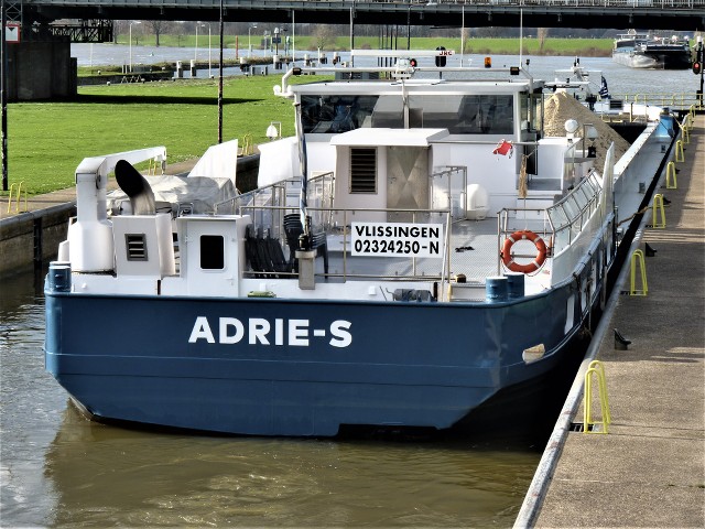 Adrie S , 85,96 x 9,03 x 3,71 , 1903 ton , Bouwjaar 1975 , Werf Schlömer in Oldersum ( Duitsland ) , 1268 pk Mitsubishi , ex Cargo Liner V , ex Inez V , ex Argo , ex Compaen , ex Cornelis , ex Tuimelaar , eigenaar van Duijn Scheepvaart in Vlissingen , ENI 02324250