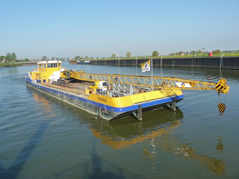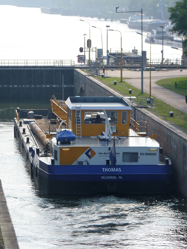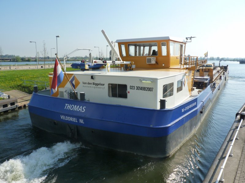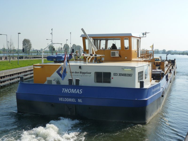 Thomas , 55,00 x 11,40 x 1,70 , 460 ton , Bouwjaar 2008 , Werf Made BV in Moerdijk ( Nederland ) , 650 pk Volvo Penta en 350 pk boegschroef , eigenaar Van den Biggelaar Aannemingsbedrijf in Velddriel , ENI 02330149