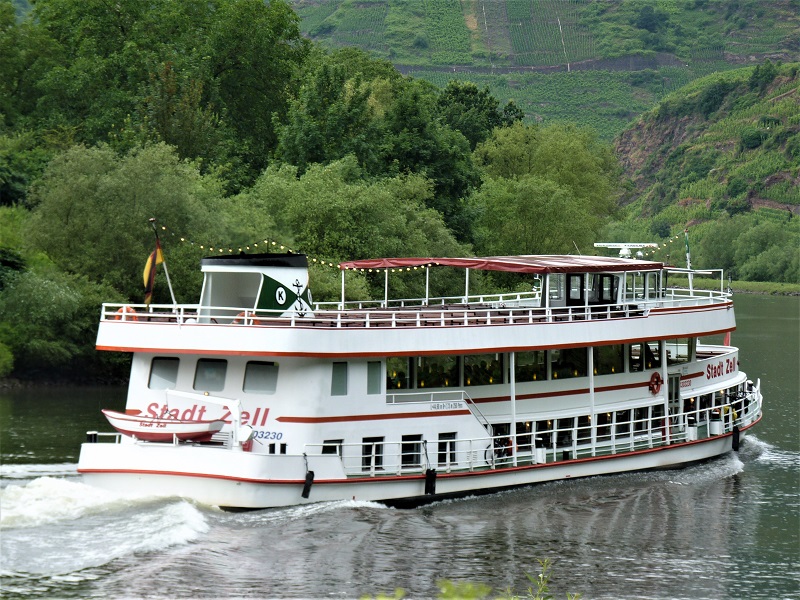 Stadt Zell , 44,68 x 7,73 x 1,10 , Bouwjaar 1930 , Werf Schmidt in Oberwinter ( Duitsland ) , 2 x 250 pk Mercedes Benz , ex Filia Rheni , eigenaar Personenschifffahrt Gebr. Kolb oHG in Briedern , ENI 04303230