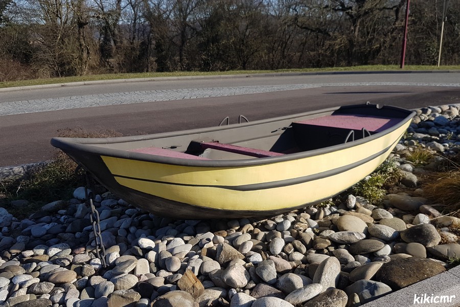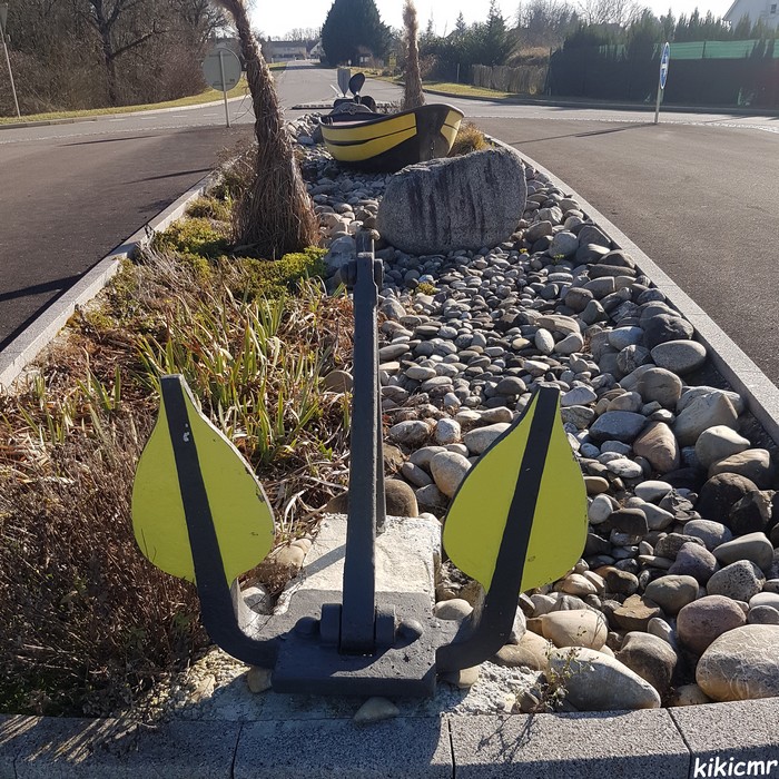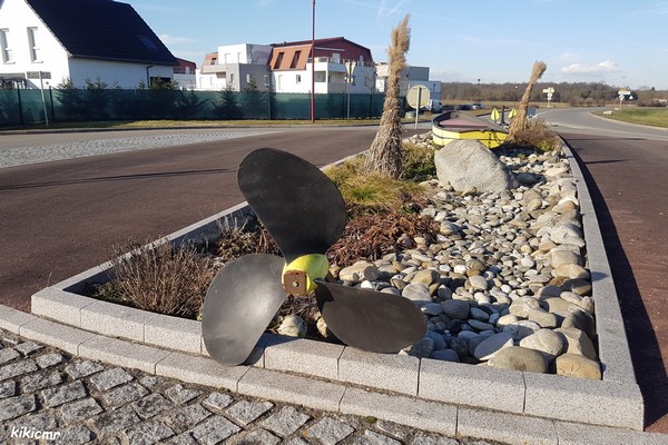 Janvier 2020, je me promenais dans le Haut-Rhin, quand je tombe, dans un village dont je ne me rappelle plus le nom, non loin de Kembs, sur un giratoire joliment décoré : d'un côté une hélice, de l'autre, une ancre, et au milieu, un bachot :