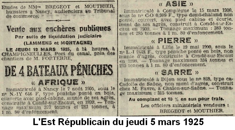 Dans L'Est Républicain du jeudi 5 mars 1925, conservé par les Bibliothèques de Nancy, disponible sur Limédia Kiosque, une annonce pour une vente aux enchères de 4 bateaux, dont trois péniches construites à Condé-sur-Escaut ; parmi eux, le