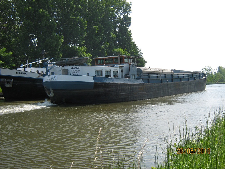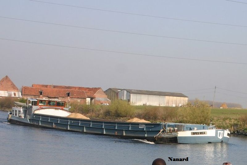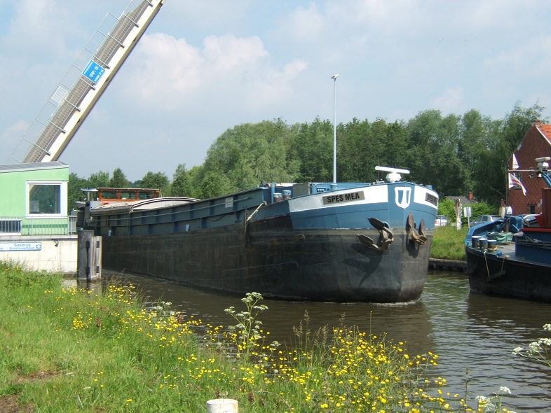 Quand on parle du loup on voit sa queue ... ou du moins son étrave. Au pont de Boortmeerbeeck avant l'écluse le SPES MEA, ex Sirona