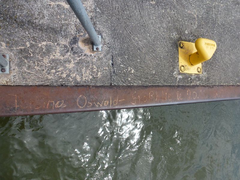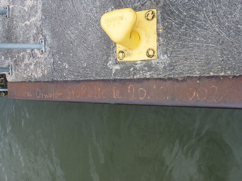 2002... c'est pas si vieux, me direz-vous... Oui, c'est vrai, mais cette signature est quand même, on peut le dire, historique : en effet, les commerces sont très très rares sur le canal des Houillères de la Sarre, depuis la fin des années 90 - début 2000. Quelques instants après avoir pris ces écrits en photo, j'ai discuté avec un éclusier qui est en service sur ce canal depuis 2002, qui m'a dit qu'il n'y aurait eu que six passages de commerces depuis cette année-là, dont le dernier en date, le SEQUENS en avril 2011, est évoqué par Pimpon ICI.