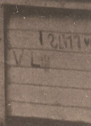 - et sur le quatrième panneau, quelque chose d'illisible, puis en petit VL (sur mon scan on ne voit que le V, sur l'original il y a un L après) et sur la ligne en-dessous, à nouveau VL :