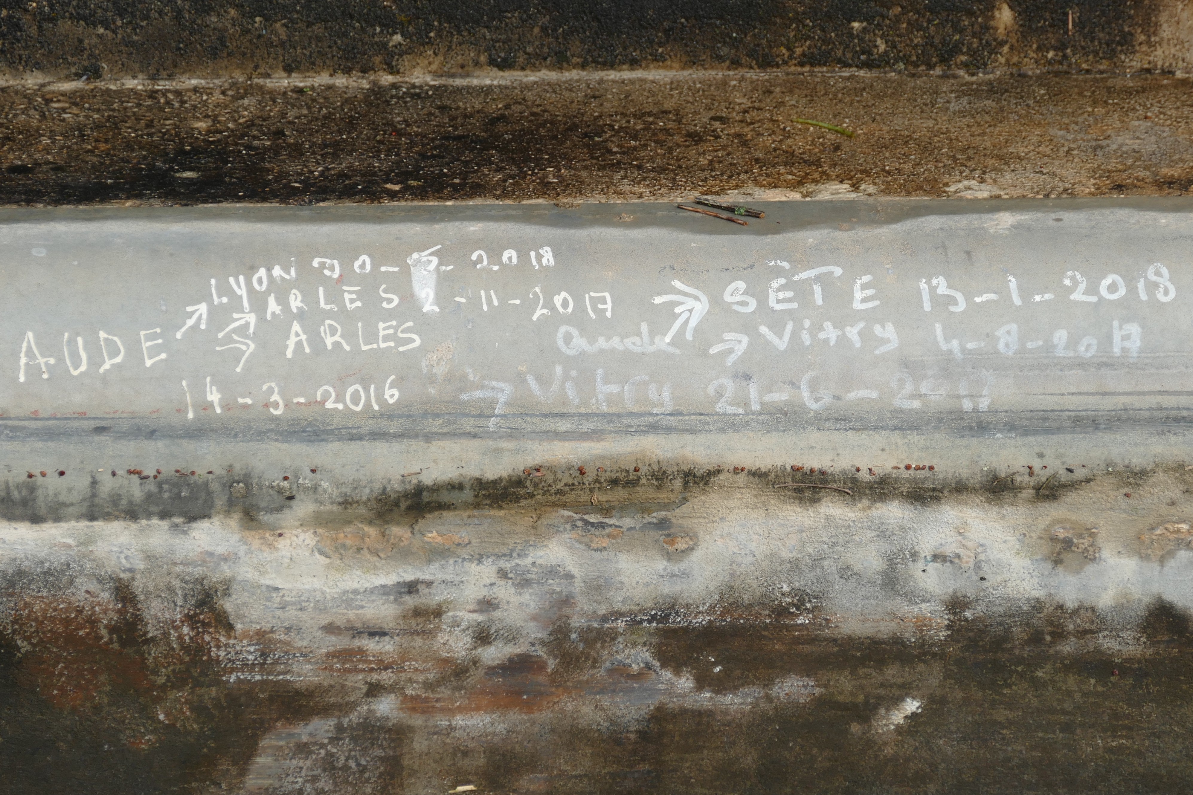 Sur la cornière du couronnement du bajoyer rive droite, des traces de différents passages du AUDE, un habitué des voyages pour le sud :