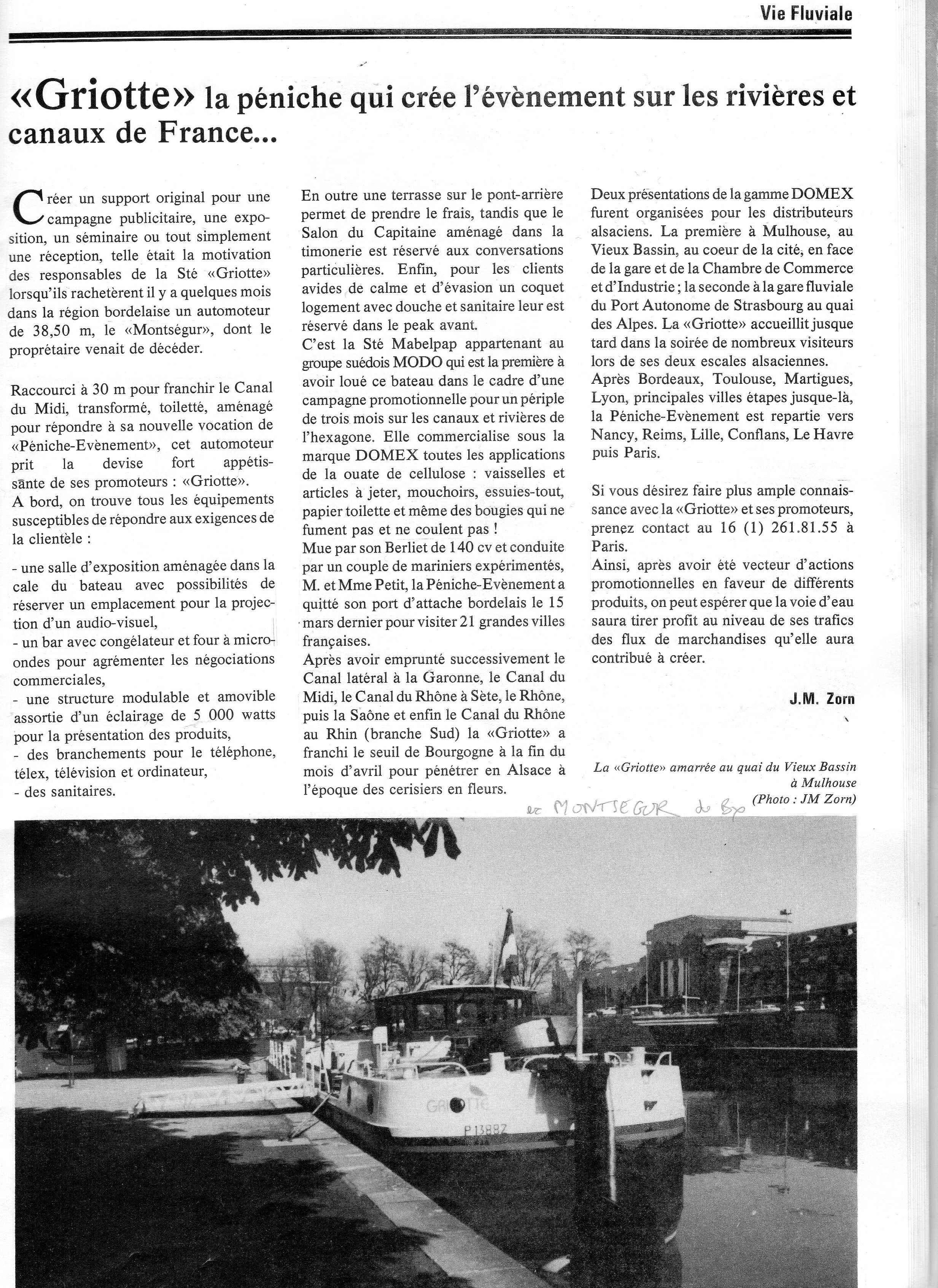 Par hasard, il y a un an je retrouve la péniche sur un site de vente via Internet, elle n’est pas revenue sur Paris, elle est à Bordeaux, confirmé par des amis sur Bord à Bord, elle aurait donc été vendue dans le sud et serait à nouveau à la vente, si ce n’est fait. Elle s’appelle toujours GRIOTTE « début 2009 » après ???