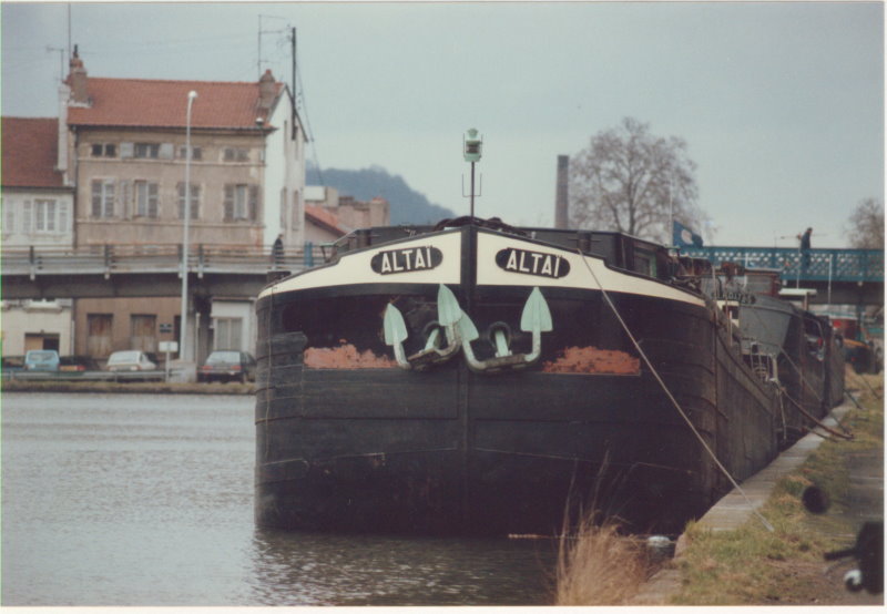 Alors, comme déjà écrit par Orvanne, la devise était ALTAI (pas Altaire). Cela doit être le bateau que j`ai pris en mars 1985 à Nancy. En printemps, on peut voir les traces de la glace encore. La peniche derrière semble être appellé ADITAS (?).