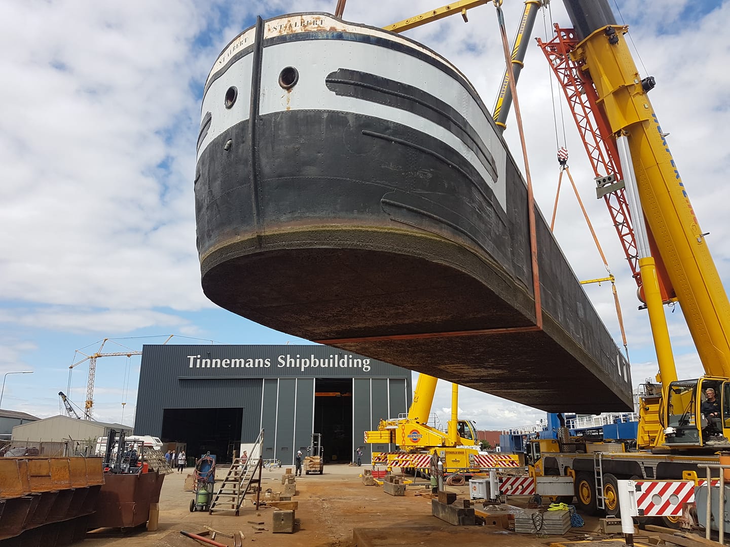 Un Arbel volant, photo publiée sur la page Facebook de Tinnemans Shipbuilding (travaux ou déchirage ?) :