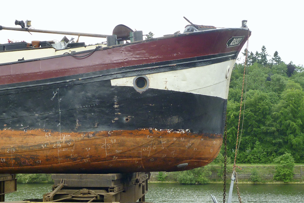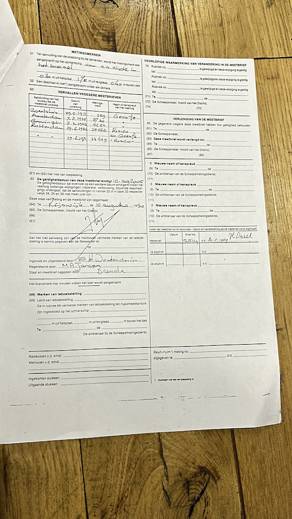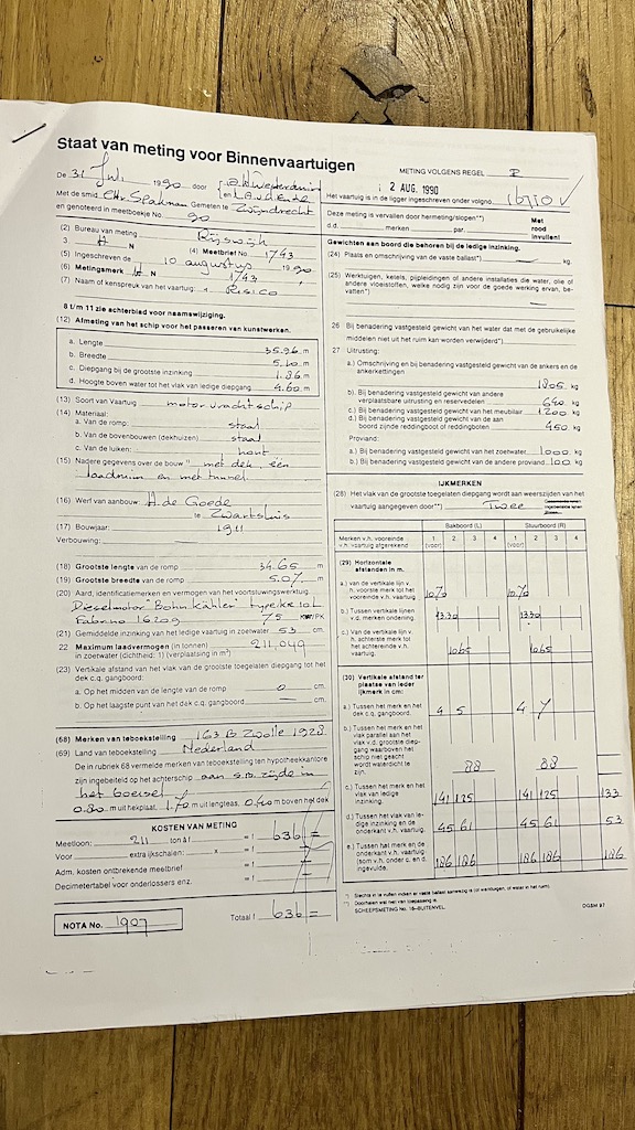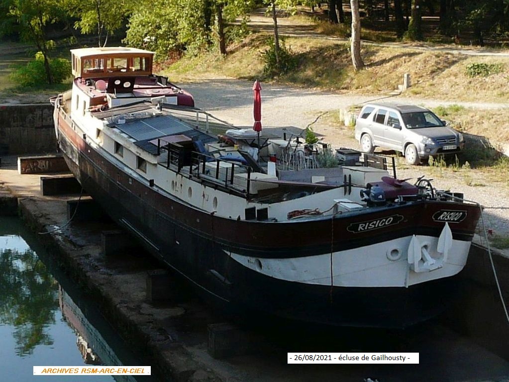Sauf erreur, on a donc un Klipper construit en 1911 au chantier H. de Goede à Swartsluis, 34,65 x 5,07m, raccourci à 29m en 1990, propulsé par un Bohn & Kahler Kr 10L, remplacé par un Ford 6cyl /90cv (?) après 2010. Motor vracht schip, bateau de commerce à l'origine, 'Risico' depuis 1980, ex 'Geesfe' dès la construction.