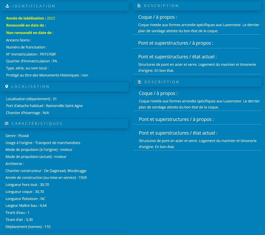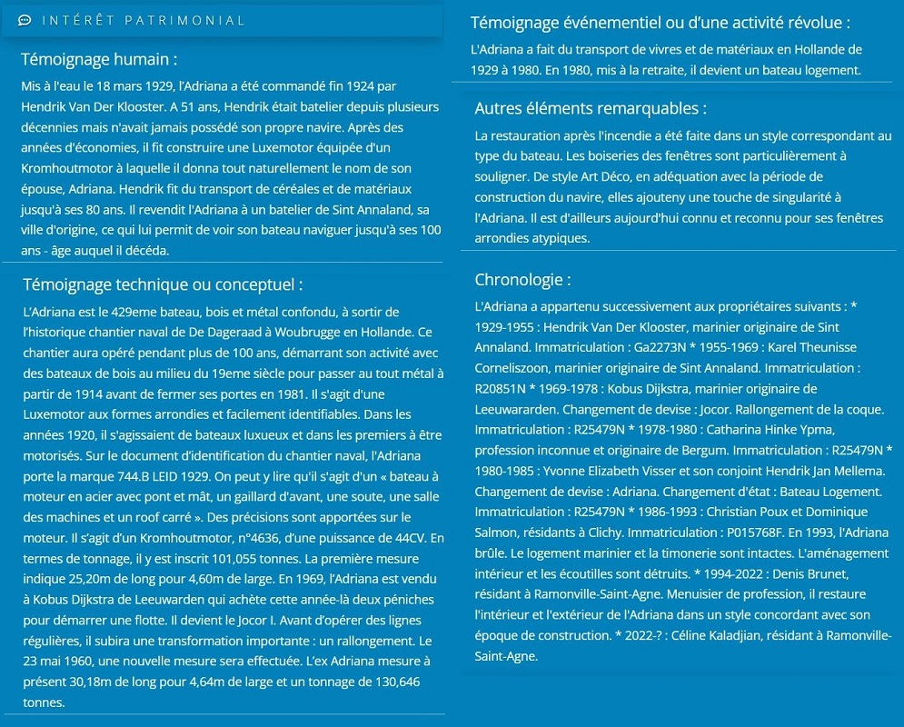ADRIANA - P15768F - a été labellisé PATRIMOINE MARITIME ET FLUVIAL en 2023.