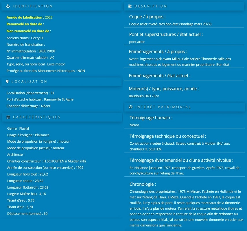 Le VINKE ZOR - Bx1909F - a été labellisé PATRIMOINE MARITIME ET FLUVIAL en 2022.