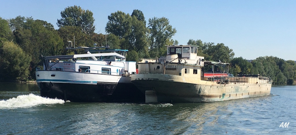 La Compagnie Générale de Navigation Havre-Paris-Lyon-Méditerranée (H.P.L.M.) a 4 remorqueurs de mer pour le transport entre Saint- Louis et Marseille, un remorqueur à hélice de 600 CV pour la navette sur le bas- Rhône entre Saint-Louis et Arles, où il tire parfois des convois de cinq à six chalands côte à côte. De Pont-Saint-Esprit à Lyon, le remorquage est coupé en trois sections. Entre Arles et Pont-Saint-Esprit, quatre remorqueurs à aubes de 800 à 1.000 CV, trains de trois chalands. De Pont-Saint-Esprit à Valence, dans les rapides, les 82 kilomètres sont partagés en sept sections de touage de 8 à 13 kilomètres, les sept toueurs enroulant leur câble à bord, pour éviter son engloutissement par les graviers, et ne remorquant généralement qu'une unité à la fois. Ce- système, qui fonctionne depuis trente-cinq ans, est plus lent que le remorquage : continu de l'autre compagnie, mais assure un service plus régulier, le toueur ne calant que 90 centimètres. Enfin, de Valence à Lyon, encore quatre remorqueurs à aubes de 800 à 1.000 CV, convois de deux ou trois unités. La Compagnie fait construire à Zurich un remorqueur à turbines, à la fois puissant et capable de fonctionner en très basses eaux.