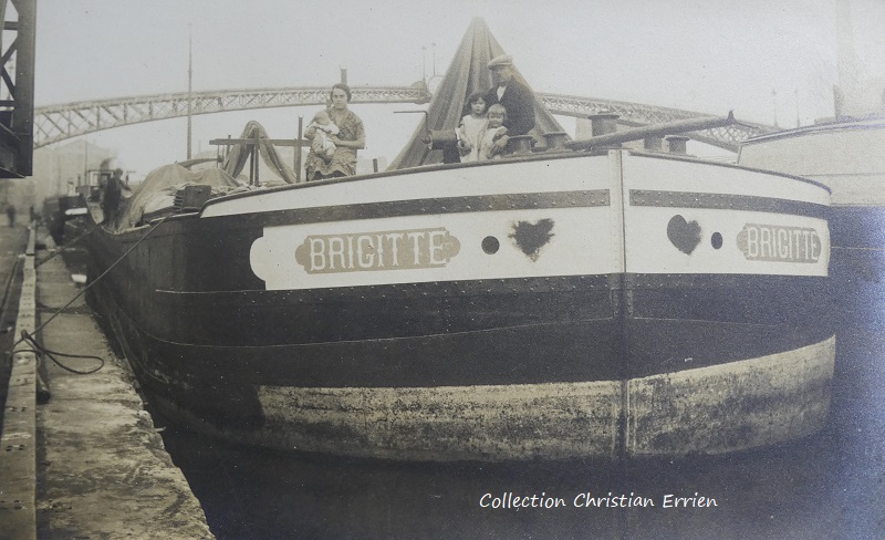 Sur cette carte photo prise à Paris (bassin de la Villette) on voit le BRIGITTE un chaland de l'armement Jules Roy.