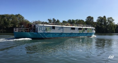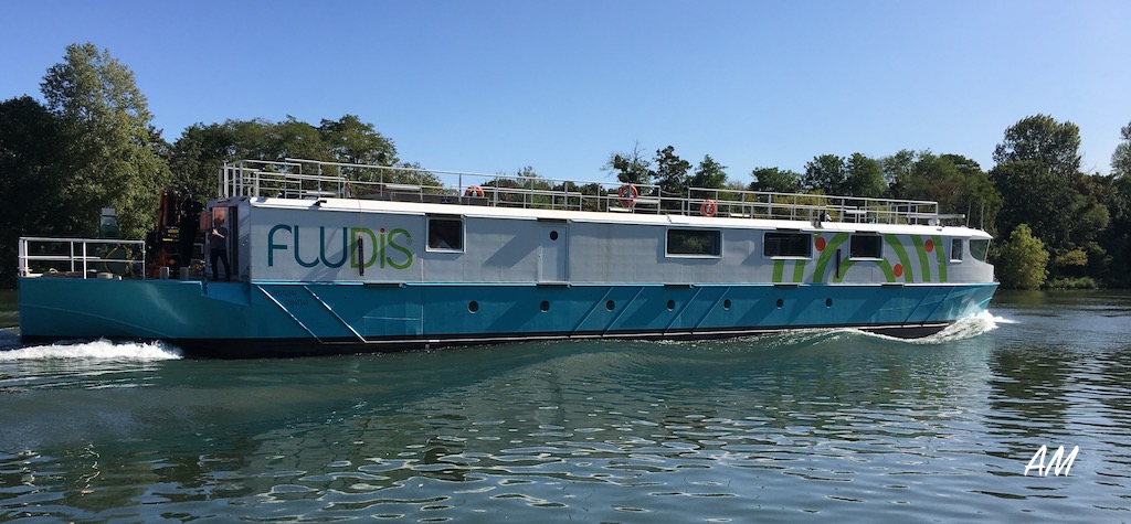 Nouvel arrivant en Seine, Fludis (01841341), un bateau neuf, a propulsion électrique sur batteries, qui fera Gennevilliers <-> Paris quotidiennement pour livrer des colis au client final avec des triporteurs. ( il y a quand même un groupe pour recharger les batteries.. ) Le bateau est conçu pour naviguer dans les deux sens, pour éviter de virer en canal. (Construit à Meuse et Sambre)