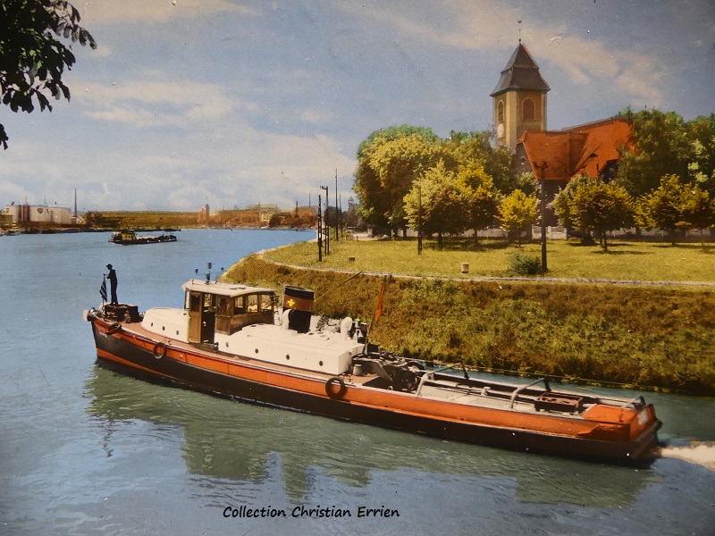 Sur cette cpsm prise à Huningue un remorqueur sort du canal. Sa devise est ZUG . D'après Binnenvaart ce remorqueur a été construit en 1942 pour l'armée Allemande au chantier Dannois A.Ustrups de Bronsodde. 23mx 3m70