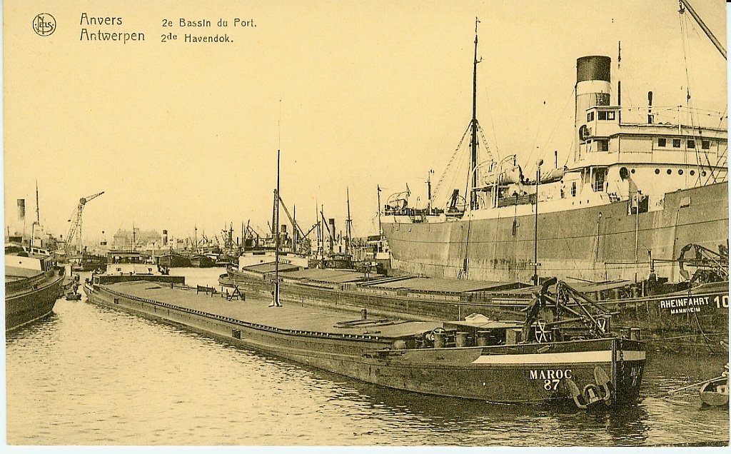 Le chaland rhénan "Maroc", construit en 1922 par Gutehoffnungshütte, Walsum (Pas "Gutte Hoffnungshütte"), avec le numéro 87 de la CFNR à Anvers.