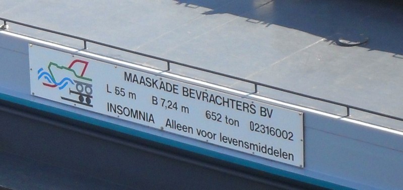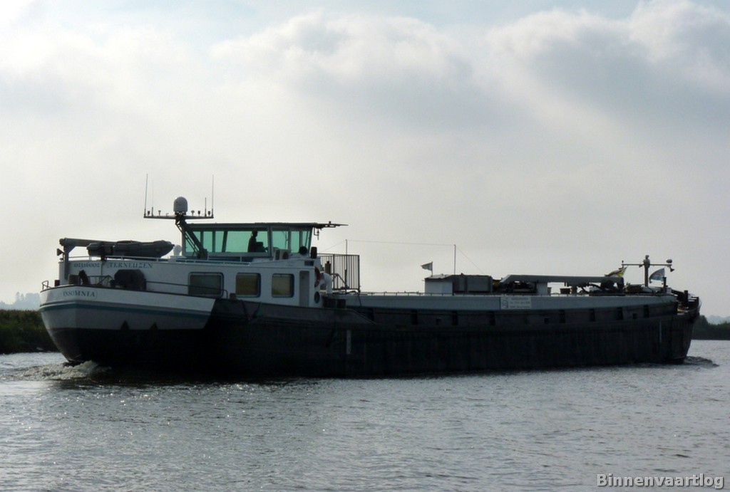 Insomnia , 54,99 x 7,24 x 2,62 , 652 ton , Bouwjaar 1961 , Werf West Vlaamse Scheepswerf in Oostkamp ( België ) , 487 pk Caterpillar en 195 pk DAF boegschroef , ex 2 x Spera , ex En-Avant , ex Erasmus , ex Insomnia , eigenaar Vof. Insomnia in Terneuzen , ENI 02316002