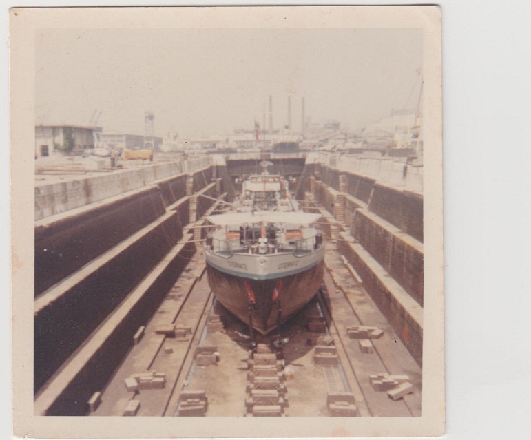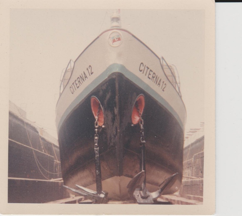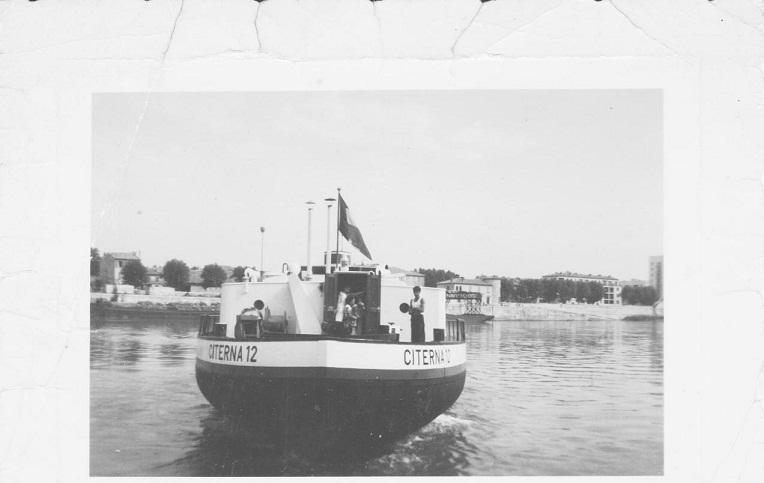 "...Le 26 janvier (1962), à la remonte, à la sortie de l'écluse de saint Pierre-Bollène : "difficulté de passage, canal gelé, avarié (sic) CITERNA 4". Comment ? Le 4 qui est devant joue le rôle de brise-glaces. Il stoppe brutalement, bloqué. Le 12 qui lui est derrière, dans le chenal libéré, et trop près probablement, ne peut ni s'arrêter, ni se dévier. Le choc est rude. Je ne sais pas quels sont les dégâts sur l'ancien bateau d'Alphonse, mais sur le nouveau, j'y ai toujours vu depuis, une belle bosse sur "le nez" immortalisée par de nombreuses photos ..."