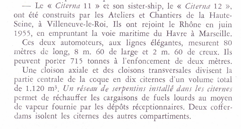 Je crois me rappeler que c'était le CITMAR -CHIMIE (CITerna MARitime), affecté à Marseille. Il a toujours mesuré 8O m et à l'origine, il emportait 1100 m3, soit presque 1000 tonnes de fuel N°2 à bloc, càd 2,30 m d'enfoncement.
