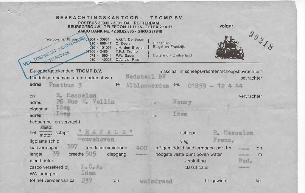 ce pavillon est connu dans le fluvial J'ai retrouvé les papiers d'un voyage effectué pour cette firme qui à le même logo (le navire à voile) Un Alblasserdam Chaumont avec du fil machine en 1986