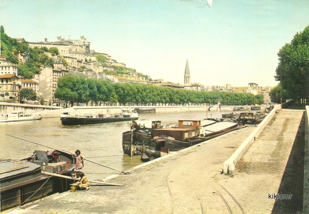 Une carte postale de Lyon, écrite en juin 1978 : Lyon - Les péniches sur la Saône - Église Saint-Georges
