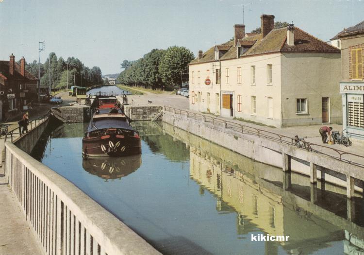 Sur une carte postale de Cépoy (exemplaire ayant voyagé en 1973), devise lisible sur les fargues et matricule lisible sur les... le... la... la tôle au bout de la cale... le truc perpendiculaire aux dennebords... (petit clin d'oeil, ICI Eddy m'avait appris que ça s'appelait "écusson", cette partie, et dans le livre "Navigation intérieure - Technique - Pratique - Réglementation" de René Jenoudet (éditions Berger-Levrault, 1957), on trouve le terme de "surbau") :