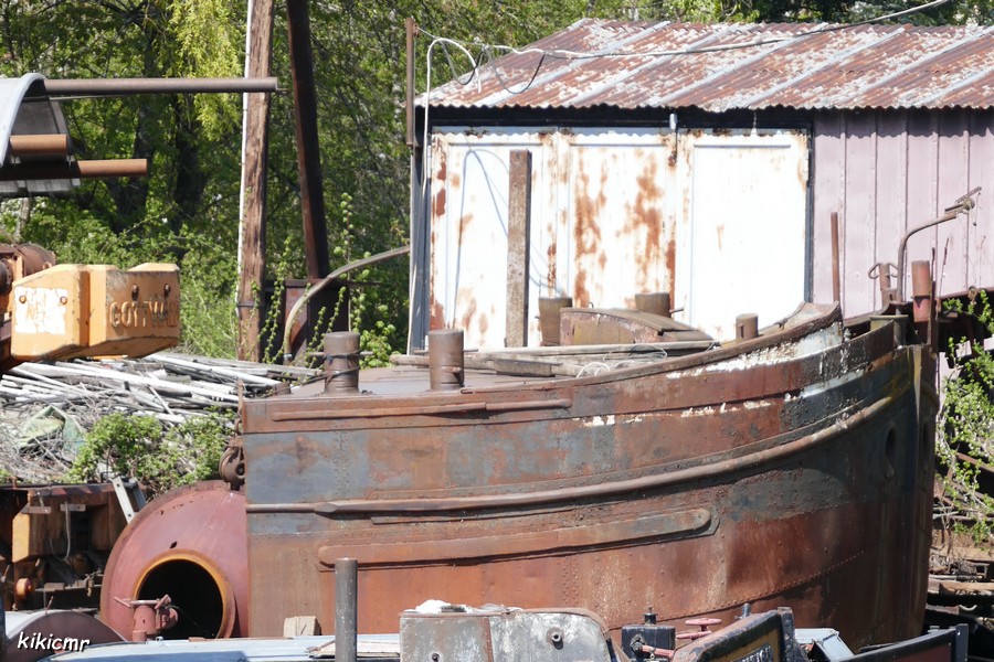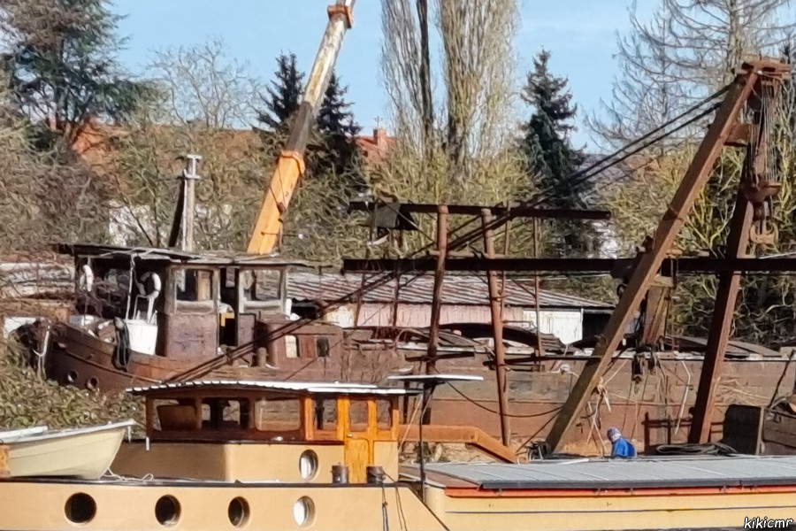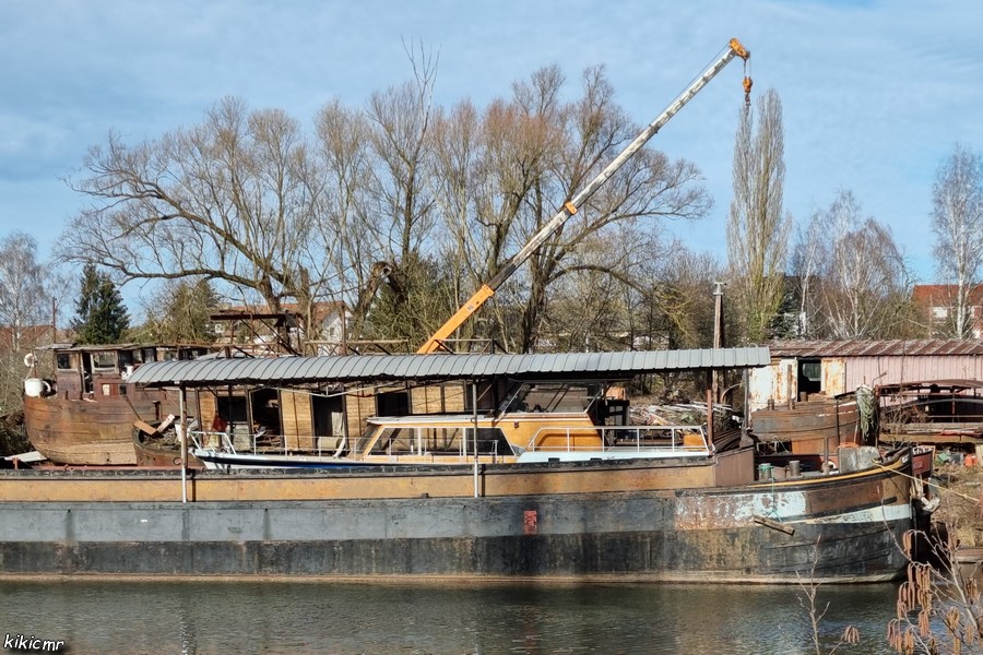 Voies navigables du Nord-Est, et comme il semble voué au déchirage, autant l'immortaliser ; le bateau dont on peut apercevoir le nez sur ces photos, amarré sur la Sarre au chantier Wirotius, c'est le