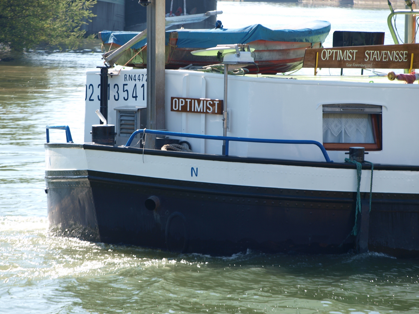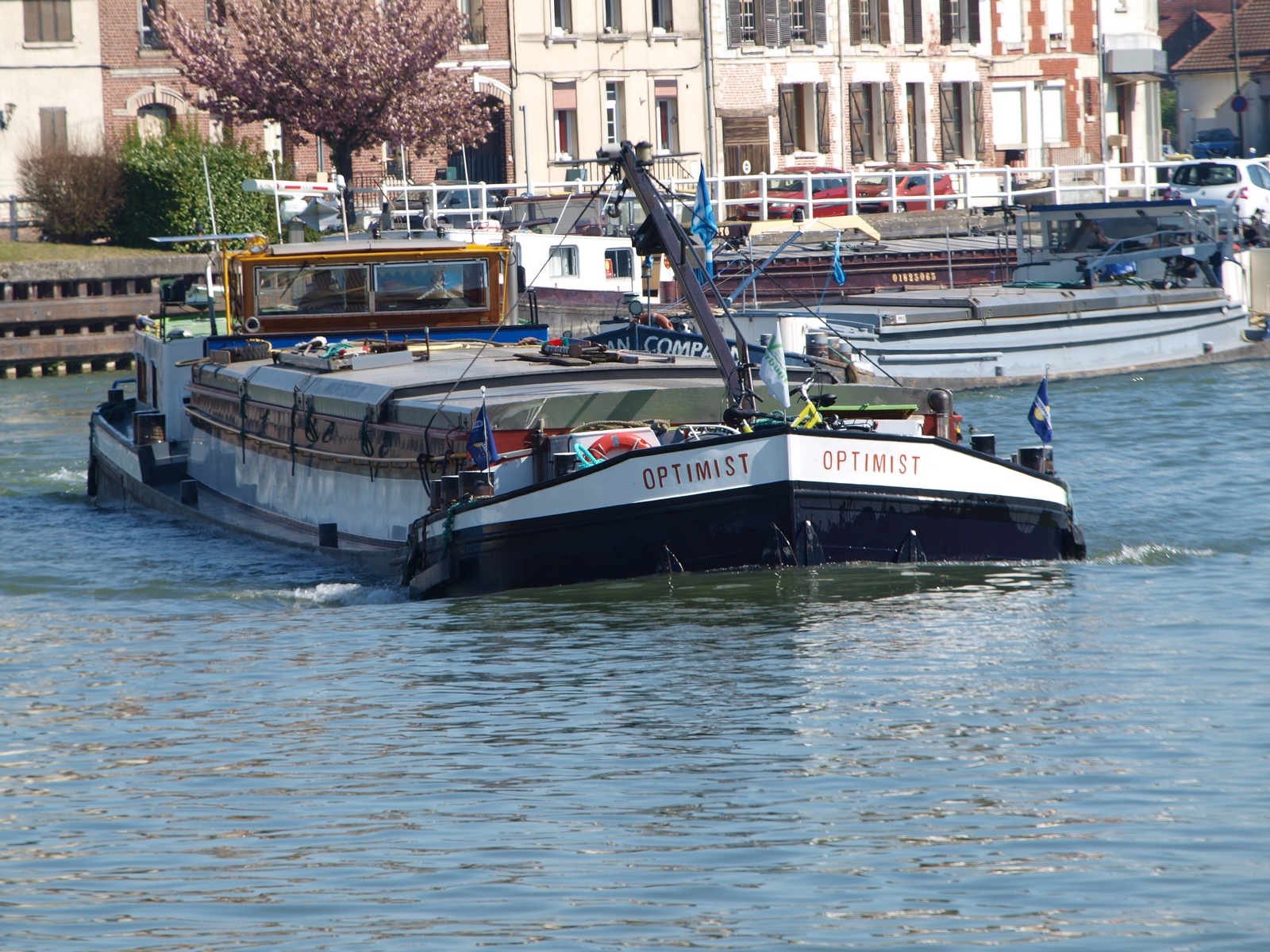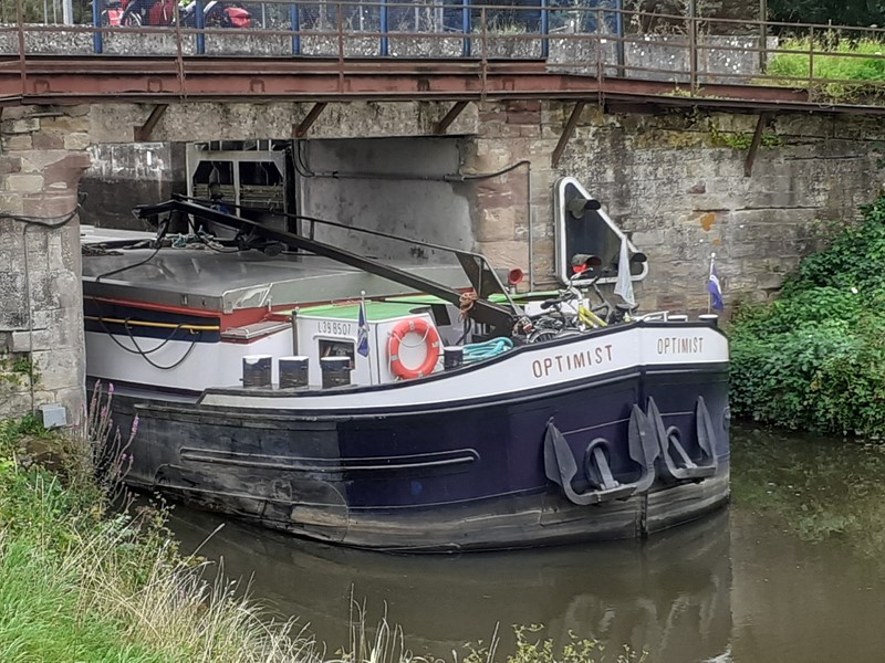 L'OPTIMIST a chargé à Fos-sur-Mer des tôles pour Thionville, il est donc passé cette semaine dans le canal des Vosges, à 1,65m d'enfoncement ; le voici le 17 août dans et à la sortie de l'écluse de l'Avière, commune de Châtel-sur-Moselle (88) :