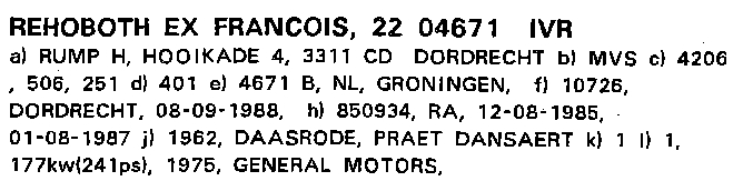 Je soupçonne que sa première devise etait Francoise au lieu de Francois, parceque j'ai trouvé une Francoise dans le registre de 1963, construit 1958 Van Praet Dansaert. Un 38.50 mtr, et je sais que le Rehoboth etait 38.5- mtr. d'origine. Peut être 1962 etait l'année de allonger???